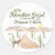 Desert Adventure Commence Succulent Boho autocollants Baby shower. Aquarelle bohème scène désert, "Let the Adventure Begin" couples design baby shower. Parfait pour le couple qui aime l'aventure et qui ne peut pas attendre de prendre leur plus grande aventure, d'avoir leur bébé! Le design est une aquarelle avec des montagnes du désert, une route pour l'aventure, des cactus et autres succulents, un coucher de soleil et un âne.