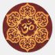Un design Aum ou Om se trouve à l'intérieur d'une fleur de lotus stylisée. Le motif circulaire est coloré d'un jaune doré qui est mis en surbrillance pour créer une brillance légère à la surface. L'arrière - plan est peint en rouge profond qui peut être vu à travers l'espace négatif de la fleur. Une ombre apparaît juste sous le design, ce qui fait qu'il semble flotter juste au-dessus de la surface de l'autocollant. Ce design élégant est une représentation frappante de ce symbole spirituel.