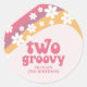 Retro a inspiré deux autocollants d'invitation de deuxième anniversaire super avec marguerites de style 70's et polices et couleurs boho.