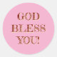 Autocollant rond rose tendre « Dieu vous bénisse ». Message chrétien sur fond rose. Personnalisez en changeant la couleur de fond avec le bouton « Modifier le design ». Profitez !