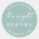 Ajoutez une touche sereine et élégante à votre dîner de répétition mariage avec cet autocollant rond bleu-vert doux avec "La nuit avant". Parfait pour les couples qui aiment les couleurs douces et modernes. Avec son design classique et minimaliste, cet autocollant est idéal pour sceller des enveloppes, décorer des sacs de faveur ou personnaliser des cadeaux pour votre célébration pré-mariage. Le ton bleu vert pâle se marie très bien avec une variété de thèmes mariages, y compris des célébrations officielles, nautiques, côtières ou d'automne.