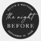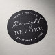 Ajoutez une touche de finition élégante à votre dîner de répétition mariage avec cet autocollant rond noir avec l'expression "La nuit avant". Conçu dans une police serif intemporelle avec un arrière - plan noir audacieux, ce étiquette de faveur minimaliste est parfait pour les thèmes de cravate noire, moderne ou monochrome mariage. Idéal pour sceller des enveloppes, des faveurs de fête, des sacs de bienvenue ou des produits de boisson lors de votre événement pré-mariage.