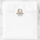 Fun dinosaure marié et marié dans un beau fleur sauvage coloré prés un sticker mariage thème dinosaure pour enchanter vos invités. Facile à customiser avec les noms des mariés et des mariés et la date du mariage dans le script de typographie moderne. Drôle Tyrannosaurus Rex marié et marié et aquarelle d'été illustrations florales dans les tons violet bleu rose vert jaune et orange. Dino original unique et oeuvres d'art florales d'été de l'artiste Catherine Sweetman