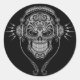 Un design élaboré de crâne à sucre DJ décoré de tourbillons complexes et de motifs à points. Les écouteurs sont assis sur le dessus du crâne avec deux fils suspendus en dessous. Les lignes et les cercles complexes sont noirs et solides, tandis que l'intérieur du crâne se termine par des nuances de gris surligné. La musique sort des écouteurs sous la forme de boulons d'éclair gris et de l'arrière - plan noir pur. Cette image agressive du Jour des Morts fait un autocollant frappant