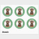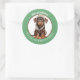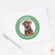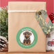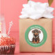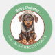 Une image d'un adorable chien chiot Doberman Pinscher noir et bronzé portant un casquette d'hiver est au centre de cet autocollant de vacances. L'image est encadrée dans une bordure circulaire verte qui contient votre texte personnalisé en blanc. Idéal pour les cartes de Noël, la correspondance et les forfaits cadeaux.