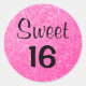 Étiquette ronde 16 sucrée avec parties scintillant rose vif et brillant noir.