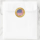 Le drapeau des États-Unis est entré dans un faux anneau d'or arrondi. Les mots "États-Unis" se trouvent en haut et en bas de la conception et ont un effet pressé. La paire de trois étoiles décoratives les unes en face des autres, est également conçue avec un effet pressé.
