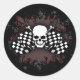 Jolly course crâne et os croisés avec à damiers drapeaux sur splatter.
