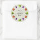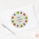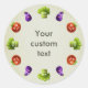 Autocollant rond personnalisable de légumes marrants avec des légumes caricaturaux mignons et amusants disposés en cercle et texte personnalisé. La tomate rouge, le brocoli vert et l'aubergine violette ont un regard étonné dans leurs grands yeux humoristiques. Cet autocollant amusant serait parfait pour les cuisiniers et les gens qui aiment la cuisine et les légumes.