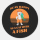 Sticker rond amusant avec un chat souriant en tenue de pêcheur Ce design adorable présente un chat gai habillé en pêcheur, tenant un poisson souriant dans ses pattes. Parfait pour les amoureux de les chats qui adorent ces animaux furieux et ludiques. Un joli ajout à toute collection !