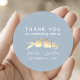 Élégant autocollant mariage rond merci avec deux tourterelles d'or sur un arrière - plan bleu poussiéreux et doux avec "Merci pour célébrer avec nous" au-dessus de vos noms et date mariage. Une belle touche de finition pour sceller des sacs de faveur, des boîtes cadeaux ou des enveloppes. Parfait pour les mariages de automne du printemps, de l'été ou du début de l'année, avec un décor romantique, pastel ou ornithologique. Entièrement personnalisable pour coordonner avec votre suite de mariage bleu et or poussiéreux.