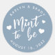 Les stickers de faveur de mariage Punny sont "menthe to be" en blanc écriture lettrée accentuée de coeurs, sur un arrière - plan bleu poussiéreux. Personnalisez avec vos noms et votre date de mariage.