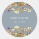 Ajoutez une touche fantaisiste et boho-chic à vos faveurs de mariage avec cet élégant autocollant rond avec des fleurs sauvages d'aquarelle dans les tons d'automne (orange brûlé, terre cuite, jaune doré) sur un arrière - plan bleu pâle. Les noms de la mariée et du marié sont mis en évidence dans la calligraphie crème moderne pour un look sophistiqué et romantique. Parfait pour sceller des enveloppes, décorer des sacs de faveur de mariage ou ajouter un détail personnalisé aux boîtes de bienvenue. Idéal pour les mariages bleus poussiéreux, les thèmes fleurs sauvages, les mariages d'automne ou d'été, les fêtes rustiques, bohème ou jardin.