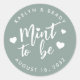Les stickers de faveur de mariage Punny sont "menthe to be" en blanc écriture lettrée accentuée de coeurs, sur un arrière - plan vert sauge poussiéreux. Personnalisez avec vos noms et votre date de mariage.