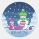 Illustration vectorielle de deux adorables bonhomme de neige en caricature vêtu de casquettes et de foulards tricotés. Le grand bonhomme de neige rusé est tricot une écharpe surdimensionnée pour le petit. Le foulard est déjà enveloppé plusieurs fois autour du mignon petit bonhomme de neige.