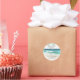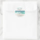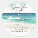 Économisez la date classique ronde autocollant - avec un magnifique océan turquoise avec une large plage de sable, accentué d'écriture et de typographie moderne. L'invitation parfaite pour votre mariage de plage ou de destination.
