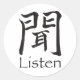 Le symbole Kanji japonais pour le mot "Ecouter" est montré dans les coups de pinceau de calligraphie et a l'air très cool sur un tee-shirt, sac, casquette, ou bouton. Nous avons même ajouté la traduction anglaise ci-dessous pour que les gens reçoivent le message. La conception du personnage est basée sur une passerelle avec une oreille à l'intérieur. Joli cool ! Vous pouvez modifier la couleur de l'arrière - plan et ajouter du texte.