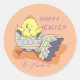 Un autocollant rond orange clair mignon avec une jolie éclosion de poussin à l'encre d'un oeuf décoré. Le texte dit "Bonne Pâques". Personnalisez-le avec le nom de votre famille. Parfait pour utiliser comme scellés d'enveloppe ou pour décorer des cadeaux. © ArianeC Illustrations-Tous droits réservés