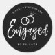 Un autocollant amusant et unique avec écriture manuscrite blanche sur fond noir, spécialement conçu pour vous pour une fête de fiançailles. Il comporte le mot "fiancés" avec des alliances posées dessus. En dessous et au-dessus figurent les noms des mariés et la date des fiançailles.