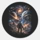 A lone astronaut stands on an alien world beneath swirling galaxies and distant starships, ready to face an epic cosmic conflict.