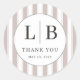 This elegant wedding sticker features a minimalist circular design with alternating beige and white vertical stripes as the background. The central focus is on two large initials separated by a line, accompanied by the phrase "THANK YOU" in a classic serif font, creating a sophisticated and formal look. The soft color palette and clean layout evoke a sense of gratitude and celebration, making it perfect for expressing thanks at your special event. Its timeless style ensures it complements any wedding theme beautifully.