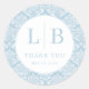 This elegant wedding sticker features a circular design with a light blue and white damask pattern, creating a classic and sophisticated look. The centerpiece includes bold serif initials "L" and "B," separated by a vertical line, surrounded by intricate floral motifs. Below the initials, the phrase "THANK YOU" is elegantly displayed in a smaller serif font, conveying gratitude. The soft color palette and formal typography make this sticker perfect for celebrating special occasions with a touch of charm and refinement.
