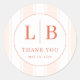 This elegant wedding sticker features a circular design with vertical beige and cream stripes as the background. The focal point is two bold, coral-colored letters "L" and "B," separated by a thin line, set above the phrase "THANK YOU" in matching coral serif font. Customizable for any date, this minimalist yet sophisticated sticker conveys gratitude and celebration, perfect for adding a personal touch to your wedding favors or thank-you notes. Its clean lines and warm color palette make it ideal for modern weddings seeking a refined aesthetic.