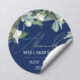 Cet autocollant rond élégant présente un design féminin stylé avec des fleurs blanches et des feuilles vertes sur un fond bleu élégant, ainsi qu'un nom personnalisable écrit à la main de manière moderne et une date personnalisable.