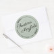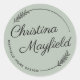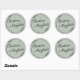 Design élégant autocollant rond personnalisé pour un propriétaire de petite entreprise dispose de votre prénom et de votre nom de famille dans le script de calligraphie moderne encadré par une couronne ronde avec des feuilles de laurier chic rustique. Personnalisez le texte courbe avec un nom commercial ou un autre libellé préféré. Les couleurs gris-vert et noir peuvent être modifiées.