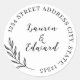 Des autocollants d'adresse ronde mariage conçus sur mesure pour les enveloppes mariages et enregistrez les dates avec un design rustique élégant de feuillage avec nom et adresse personnalisés.