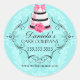 © 2013 Socialite Designs. Notre boîte de boulangerie de pâtisserie de couture sceaux / autocollants ont un élégant gâteau avec des fleurs et tourbillons, et surmonté d'un arc. L'aqua arrière - plan est un subtil design damassé. Le texte de votre entreprise s'insère dans une décoration élégante de défilement.
