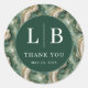 This elegant wedding sticker features a circular design with a luxurious marbled background in shades of green, cream, and gold. The central dark green circle highlights the initials "L | B" and the phrase "THANK YOU," set in a classic serif font that adds sophistication. Customizable for any date, this sticker conveys gratitude and celebration, perfect for commemorating your special day. Its modern yet timeless aesthetic makes it an ideal choice for expressing heartfelt thanks at weddings or other significant events.