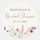 Élégantes autocollants de douche de mariée floraux comportant une bordure inférieure de fleurs sauvages aquarelles et de feuillage dans des nuances de rose, jaune, violet, bleu et vert sur un fond crème. Personnalisez les autocollants de douche de mariée de fleurs sauvages avec le nom de la future mariée et la date. Les autocollants personnalisés de fleurs sauvages sont parfaits pour les douches de mariée de printemps et d'été. Scellez les enveloppes d'invitation, les faveurs de douche de mariée, et plus encore !