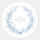 stickers de mariage victorien classique, avec une délicate aquarelle bleue couleur bleu foncé design de crête florale et un élégant monogramme. Le design botanique doux encadre magnifiquement les initiales du couple, créant un look intemporel et sophistiqué.