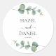 Ajoutez une charmante touche botanique à votre papeterie mariage, faveurs ou emballage avec cet élégant autocollant mariage de verdure à l'eucalyptus. Doté de sprigs d'eucalyptus couleur douce et de typographie noire classique, cet autocollant rond est entièrement personnalisable avec vos noms et date mariage. Parfait pour sceller des enveloppes, décorer des sacs de faveur ou rehausser votre thème mariage global avec une élégance naturelle cohésive.