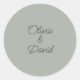 Ajoutez une touche raffinée à votre papeterie mariage avec cet élégant autocollant rond vert sauge, customisé avec les noms du couple dans une belle police de script. Parfait pour sceller les enveloppes, les sacs de faveur, les boîtes cadeaux ou ajouter un détail personnel à la décoration mariage. Un détail intemporel et élégant pour votre journée spéciale !