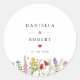 This charming round wedding sticker features a delicate wildflower border in soft, vibrant hues, adding a fresh, romantic touch. The couple’s names are displayed in a clean, modern font with a small red heart beneath, followed by the wedding date in a simple style. Perfect for sealing envelopes, favor packaging, or adding a personalized touch to your wedding décor.