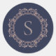 Élégant Monogramme Classique Moderne Insigne Autocollant. De beaux autocollants avec du texte gris sur fond bleu marine orné d'un joli monogramme à une seule lettre dans un cadre d'insigne circulaire couleur rose cuivré. Personnalisez avec votre initiale de monogramme. Nous vous invitons à visiter notre magasin, Austen & Grace, pour voir les produits assortis et plus encore. Veuillez nous contacter si vous avez besoin d'aide.