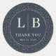 This elegant wedding sticker features a circular design with a dark navy background adorned with small white dots, creating a subtle texture. The centerpiece includes the initials "L" and "B," separated by a vertical line, followed by the phrase "THANK YOU" in a clean serif font. The minimalist style emphasizes sophistication and appreciation, making it perfect for expressing gratitude at your special event. The overall layout is balanced and visually appealing, ensuring that the message remains clear and impactful.