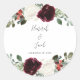 Ces élégants autocollants de mariage d'hiver de Noël sont parfaits pour les faveurs de réception de mariage. Des autocollants de coordination complètent votre réception de mariage, dîner de répétition ou douche nuptiale. Le design présente de belles fleurs d'aquarelle blanche et bordeaux avec une végétation de pins, de baies saintes et d'eucalyptus. Il s'agit d'une palette de couleurs parfaite pour un mariage d'hiver. Faites de cet autocollant votre propre nom en incluant votre nom et votre date de mariage.