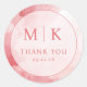 This wedding sticker features a circular design with a soft, watercolor-like background in hues of pink and white. The layout is symmetrical, showcasing bold uppercase serif letters "M" and "K," separated by a vertical line, followed by the phrase "THANK YOU" in smaller text. The minimalist style combines vintage charm with elegant typography, creating a warm and appreciative mood perfect for expressing gratitude at your special event.