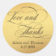 Un autocollant de remerciement très élégant pour les faveurs de mariage, la correspondance et plus encore, ce design présente une belle police de script de calligraphie avec fleuris sur un arrière - plan d'or. Modifiez avec vos noms et la date du mariage ou tout autre texte souhaité.