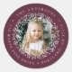 Ajoutez une touche festive à vos enveloppes de vacances avec nos étiquettes d'adresse de retour Elegant Snowflake Wreath. Les autocollants d'adresse de retour de vacances comprennent votre photo entourée d'une couronne de flocons blancs et de branches de pin avec un arrière - plan mauve de baies. Votre nom de famille et votre adresse de retour sont affichés en lettres blanches sur le bord extérieur des autocollants ronds.