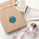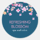 Élégant autocollant classique rond chic en fleur de cerisier avec une jolie fleur de cerisier rose sur un arrière - plan bleu avec un texte rose et blanc pour que vous personnalisiez avec votre nom ou votre message. Idéal pour la marque, l'emballage ou comme autocollants de faveur à des fins promotionnelles.