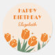 Fleur de tulipe rétro avec typographie vibrante sur autocollant d'anniversaire arrière - plan orange. Accessoires de fête élégants. Customisez le texte pour répondre à vos besoins !
