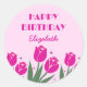 Fleur de tulipe rétro avec typographie vibrante sur autocollant d'anniversaire arrière - plan rose. Accessoires de fête élégants. Customisez le texte pour répondre à vos besoins !