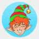Illustration originale d'un elfe de Noël joyeux aux cheveux rouges et d'un casquette rouge et vert festif sur un arrière - plan bleu hivernal.