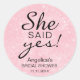 Joli autocollants/étiquettes personnalisés pour cadeau de douche nuptiale faveurs ou enveloppes scellés. "Elle a dit oui !" avec un motif arrière - plan parties scintillant faux rose. Faux confettis d'or. Modèles modifiables - ajoutez votre texte.