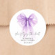 Élégants autocollants pour vos invitations de douche de mariée, faveurs de fête et cartes de remerciement avec un nœud violet aquarelle, "elle noue le nœud" dans un script calligraphique chic, et le nom de la mariée et la date de la douche dans une écriture moderne simple.