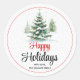 Arbre de Noël extérieur Happy Holidays Classic Round Sticker. Ce sapin de Noël extérieur capte l'essence de la saison des Fêtes avec un magnifique paysage hivernal, mettant en valeur des arbres chargés de neige décorés de couleurs vives. Le message audacieux "Joyeuses fêtes" attire l'attention, complété par de délicats flocons de neige gris qui dérivent dans l'arrière - plan, renforçant l'atmosphère hivernale enchanteresse.